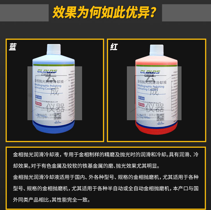 金相拋光潤(rùn)滑冷卻液,專(zhuān)門(mén)用于金相制樣的精磨及拋光時(shí)的潤(rùn)滑和冷卻。具有很好的潤(rùn)滑、冷卻效果。對(duì)于有色金屬及較軟的鐵基金屬的磨、拋效果尤其明顯。