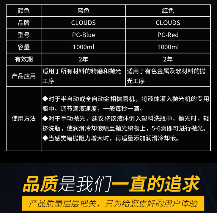 金相拋光潤(rùn)滑冷卻液適用于國(guó)內(nèi)、外各種型號(hào)、規(guī)格的金相拋磨機(jī),尤其適用于各種型號(hào)、規(guī)格的金相拋磨機(jī),尤其適用于各種半自動(dòng)或全自動(dòng)金相拋磨機(jī),本產(chǎn)口與國(guó)外同類(lèi)產(chǎn)品相比,其性能完全一致。